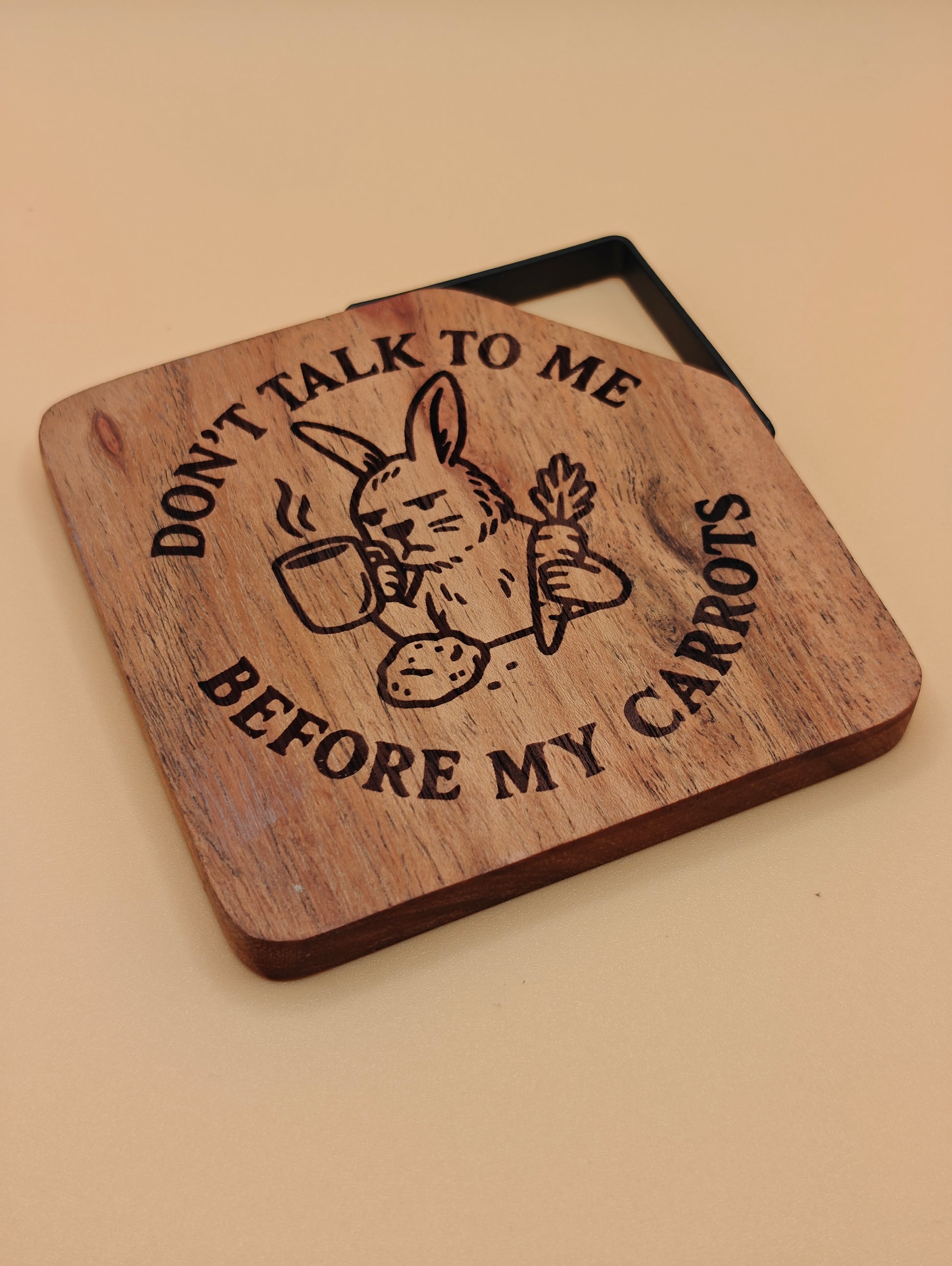 Breng een vleugje humor en charme in je interieur met deze duurzame bamboe onderzetter, voorzien van een gegraveerde illustratieen de grappige tekst.